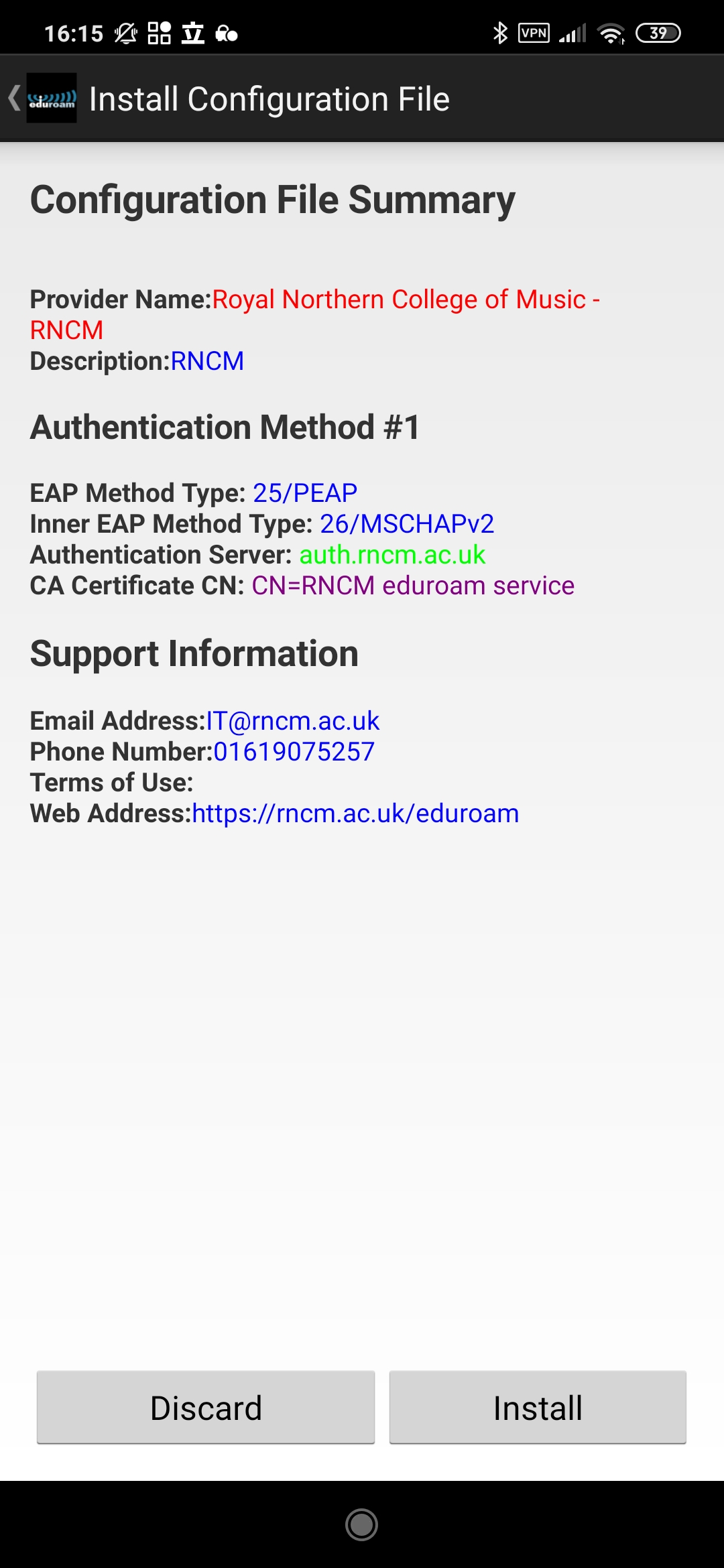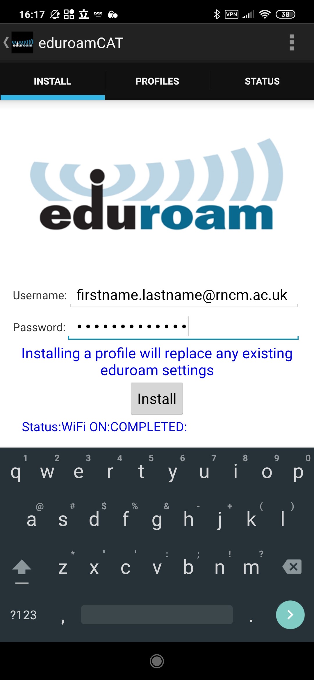 Use the 'eduroam CAT' app to install the 'Royal Northern College of Music' profile.