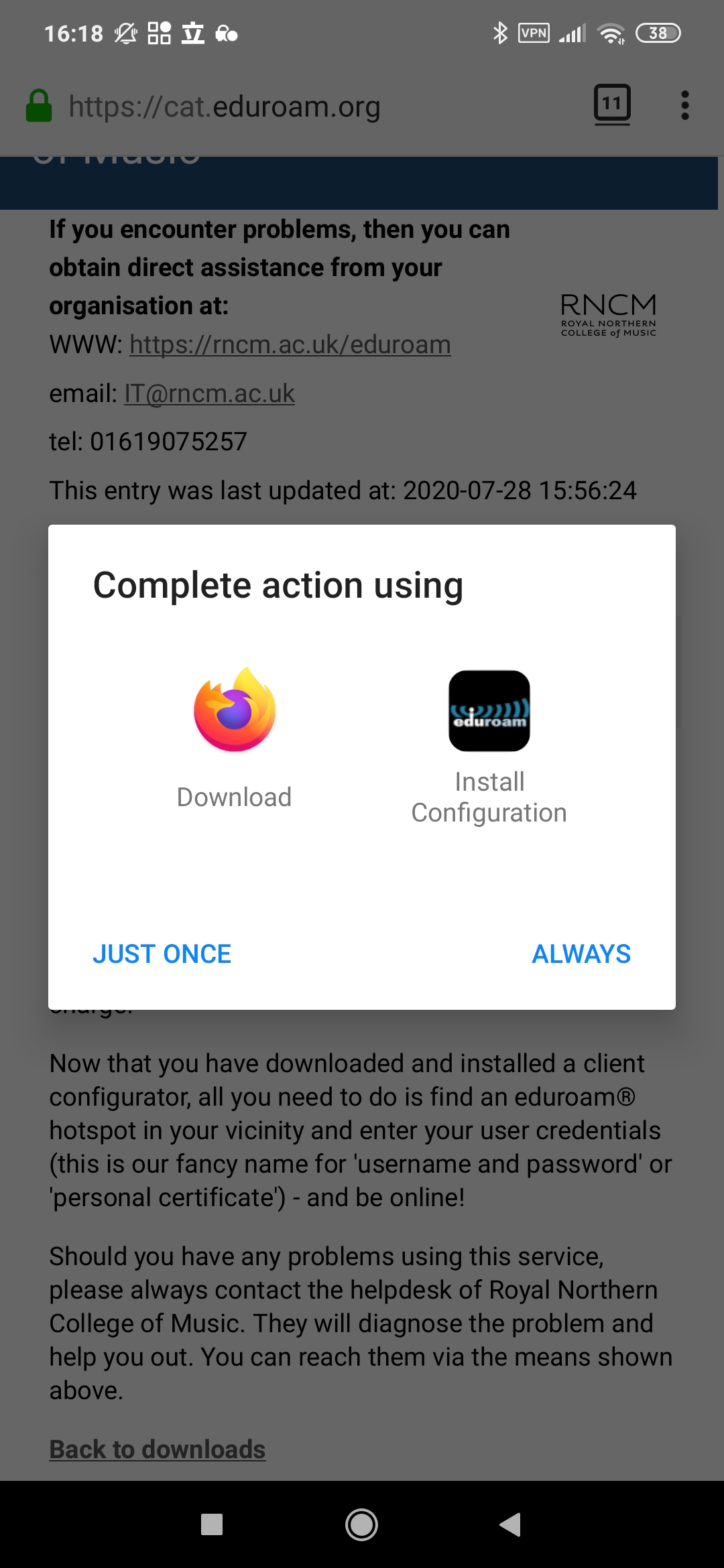 1. Go here and install the Geteduroam app. If you currently don't have an internet connection and are in college connect to RNCM-General first so that you can get to the play store to download the app.