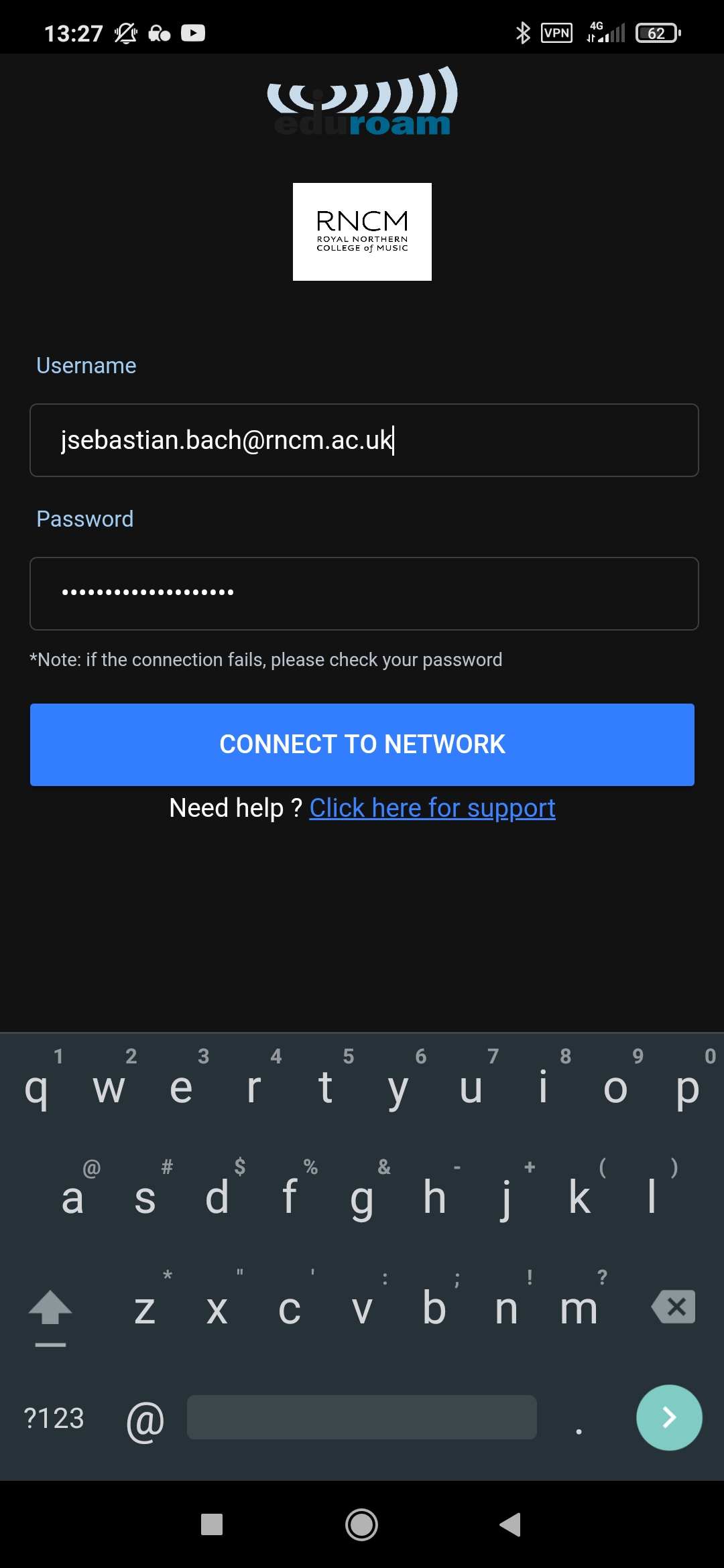 • For the 'username', type in your RNCM email address eg blo1658235@student.rncm.ac.uk