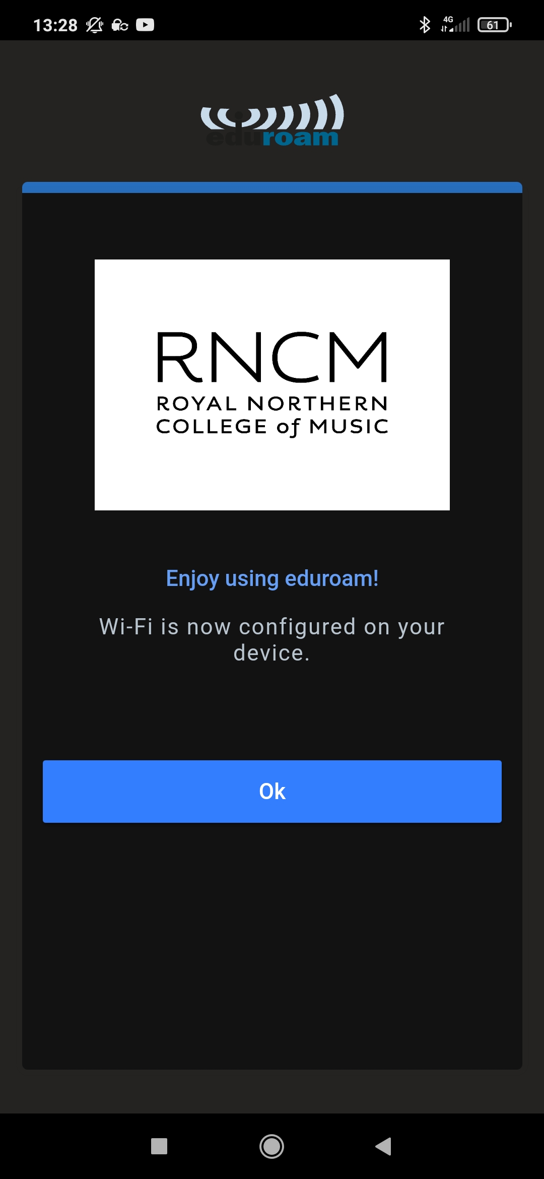 The app doesn't check if the password you have entered is correct. If you still can't get online try repeating from step 2 and enter your password again. If that still doesn't work please contact us at it@rncm.ac.uk