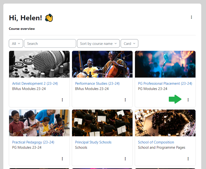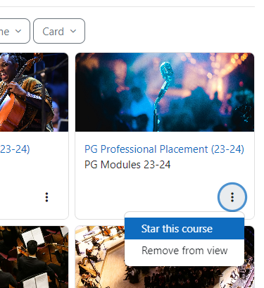 Once you've logged into Moodle, and you are viewing your courses under 'card' view, click the three dots next to the course you'd like to star.