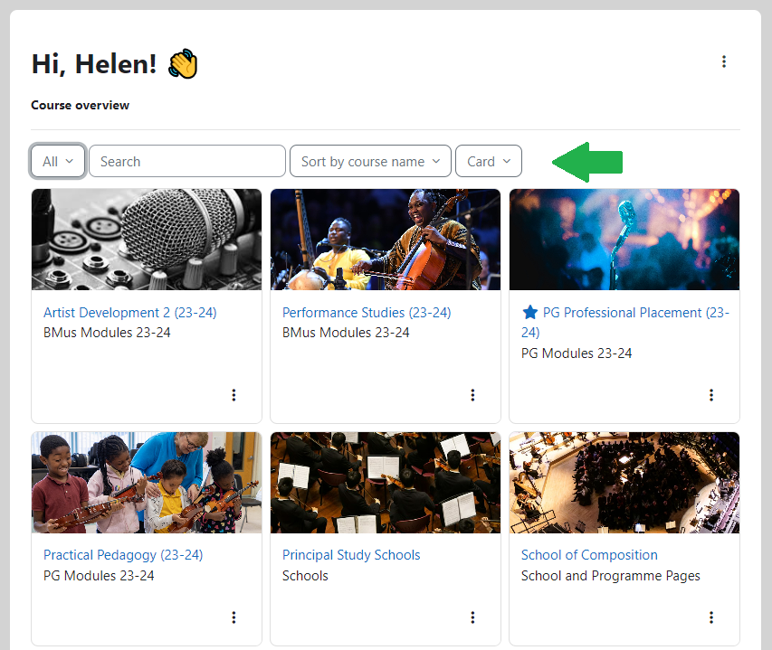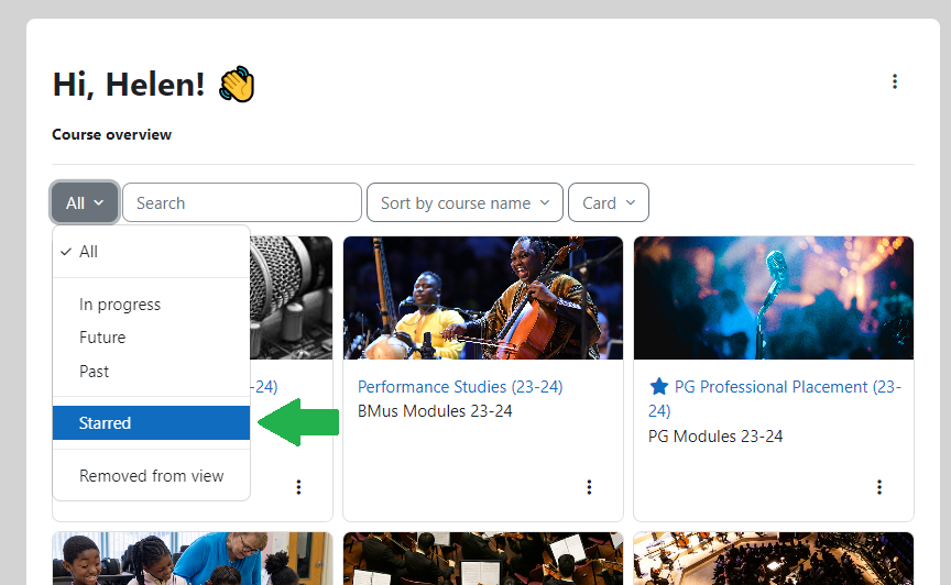 To view only the starred courses, select 'Starred' under the first drop down menu above the course cards.